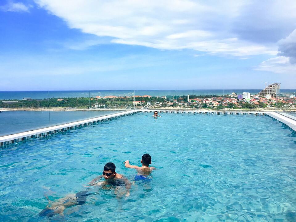 Bể bơi vô cực nằm ở vị trí cao nhất của khách sạn, được thiết kế với diện tích rộng hơn 100m2, xung quanh được bao bọc bởi những tấm kính cường lực trong suốt giúp du khách có một cách nhìn bao quát toàn thành phố Đồng Hới thơ mông, dòng sông Nhật Lệ trữ tình và bờ biển nên thơ trải dài cát trắng.